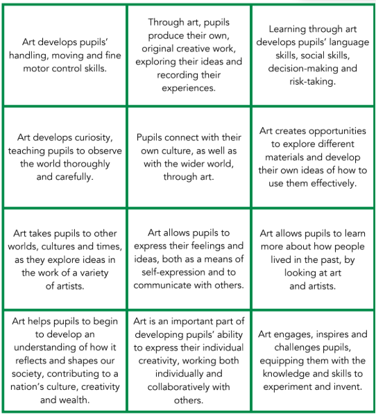 At Weedon Bec, we believe that art gives children an opportunity to be inventive and engages them in a process that helps to develop self-esteem, self-discipline, individuality and self-expression. The skills children learn in Art are both transferable and open-ended. There is no right or wrong way, and it opens a path of success for those that find core subjects more difficult. Our intent is that children develop a love and passion for Art. Through self-belief and nurturing expression, everybody is able to succeed and feel pride. By the time children leave Weedon Bec our children will become confident and proficient in a variety of techniques including drawing, painting, sculpting, as well as other selected craft skills. Children will also develop their knowledge of famous artists, designers and craft makers and be able to express themselves through a rich range of mediums and genres.